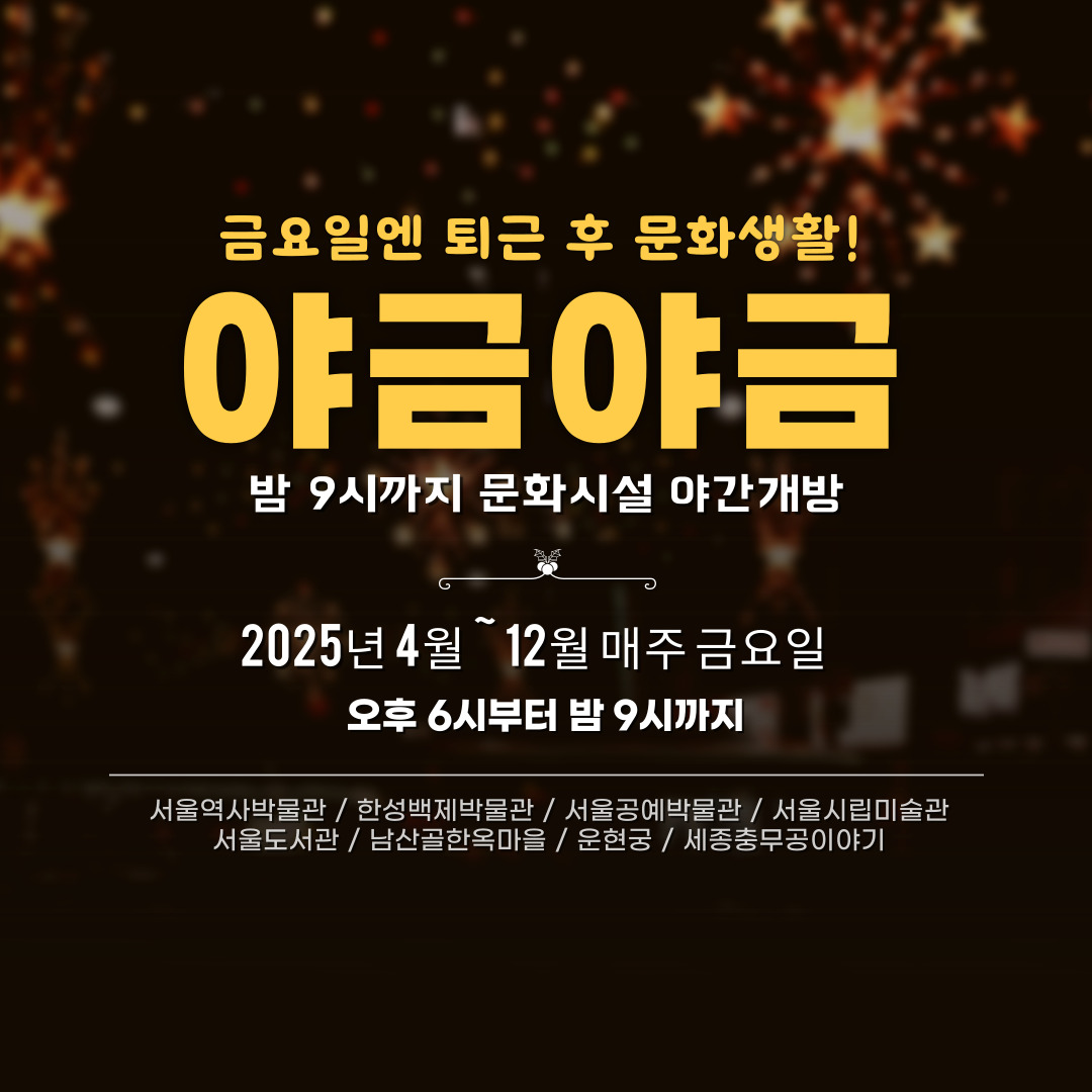 서울시는 매주 금요일 저녁, 시민들이 퇴근 후 여유롭게 문화생활을 즐길 수 있도록 주요 시립문화시설을 밤 9시까지 연장 운영하는 '문화로 야금야금(夜金)' 사업을 시작합니다. 이 프로그램은 다양한 문화 체험과 이벤트를 통해 시민들이 보다 풍성한 문화생활을 누릴 수 있도록 돕습니다.