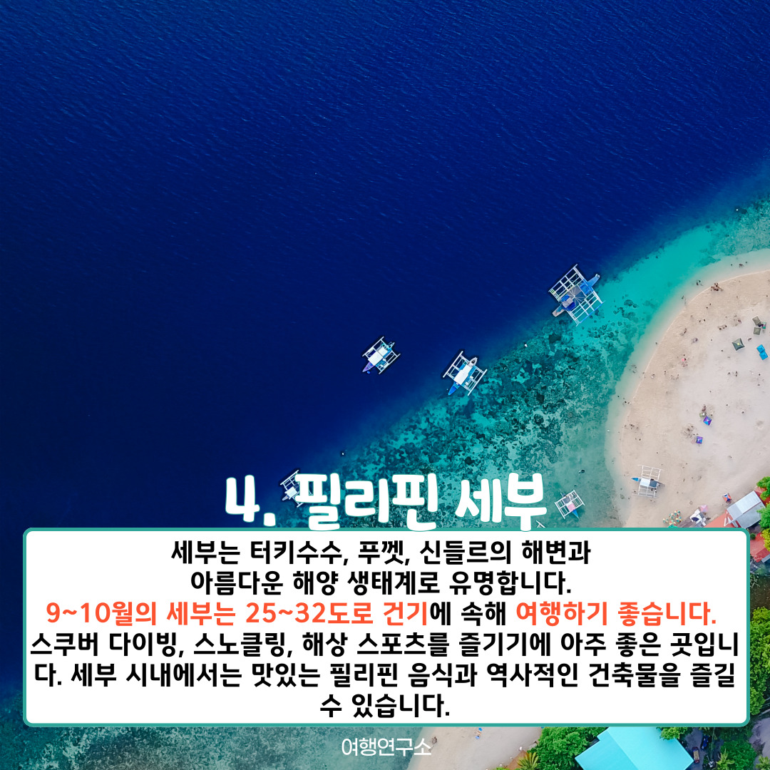 세부는 터키수수, 푸켓, 신드르의 해변과 아름다운 해양 생태계로 유명합니다. 9~10월의 세부는 25~32도로 건기에 속해 여행하기 좋습니다. 스쿠버 다이빙, 스노쿨링, 해상 스포츠를 즐기기에 아주 좋은 곳입니다. 세부 시내에서는 맛있는 필리핀 음식과 역사적인 건축물을 즐길 수 있습니다.