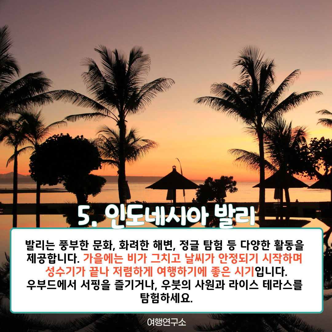 발리는 풍부한 문화, 화려한 해변, 정글 탐험 등 다양한 활동을 제공합니다. 가을에는 비가 그치고 날씨가 안정되기 시작하며 성수기가 끝나 저렴하게 여행하기에 좋은 시기입니다. 우부드에서 서핑을 즐기거나, 우붓의 사원과 라이스 테라스를 탐험하세요.