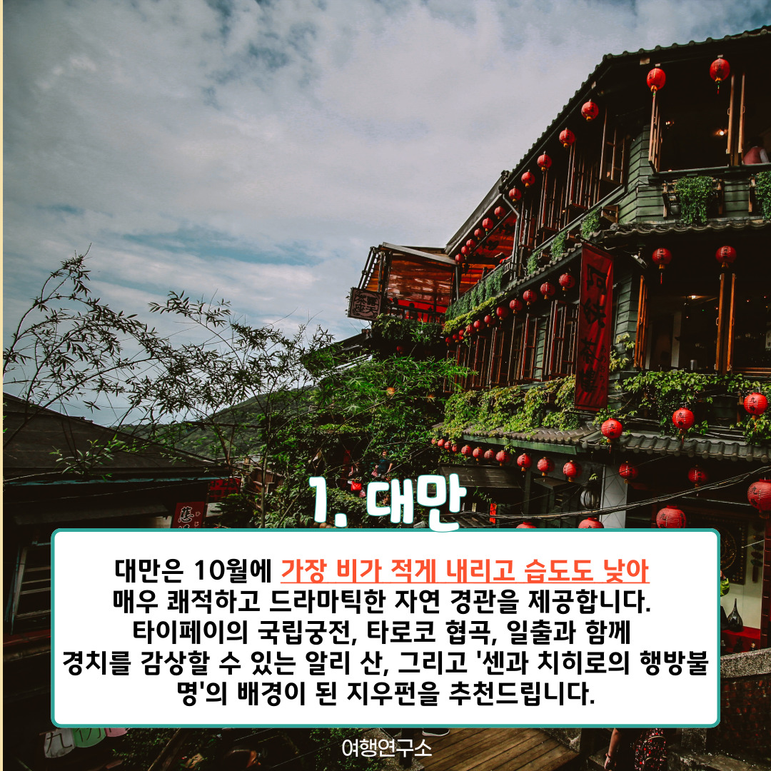 대만은 가을에 가기에 완벽한 나라입니다. 10월에 가장 비가 적게 내리고 습도도 낮아 매우 쾌적하고 드라마틱한 자연 경관을 제공합니다. 타이페이의 국립궁전, 타로코 협곡, 일출과 함께 경치를 감상할 수 있는 알리 산, 그리고 '센과 치히로의 행방불명'의 배경이 된 지우펀을 추천드립니다.