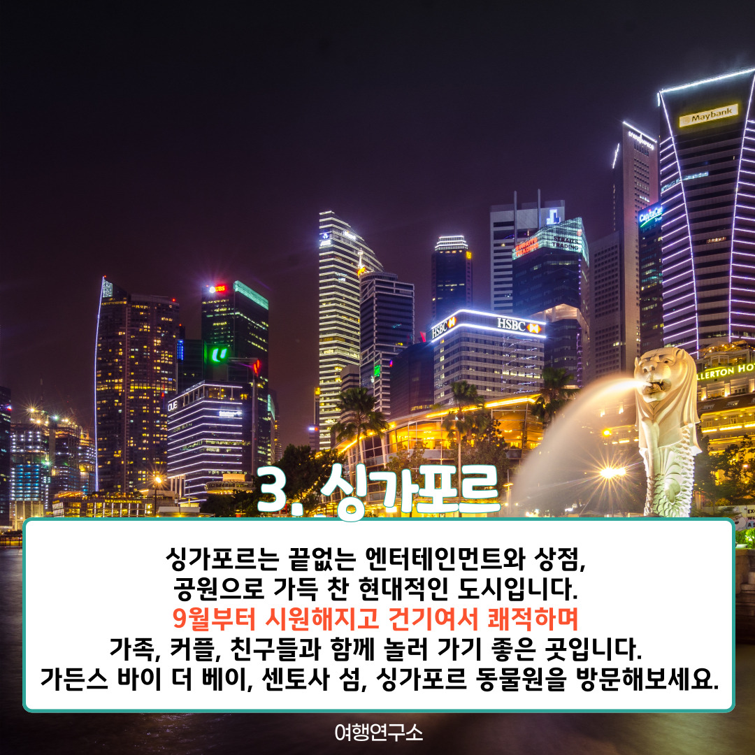 싱가포르는 끝없는 엔터테인먼트와 상점, 공원으로 가득 찬 현대적인 도시입니다. 9월부터 시원해지고 건기여서 쾌적하며 가족, 커플, 친구들과 함께 놀러 가기 좋은 곳입니다. 가든스 바이 더 베이, 센토사 섬, 싱가포르 동물원을 방문해보세요.