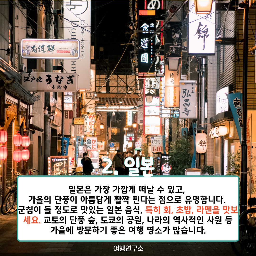 일본은 가장 가깝게 떠날 수 있고, 가을의 단풍이 아름답게 활짝 핀다는 점으로 유명합니다. 군침이 돌 정도로 맛있는 일본 음식, 특히 회, 초밥, 라멘을 맛보세요. 교토의 단풍 숲, 도쿄의 공원, 일본의 역사적인 사원 등 가을에 방문하기 좋은 여행 명소가 많습니다. 특히!! 요즘 엔화 환율이 800원대라는 점!!! 서둘르세요!! gogo!!