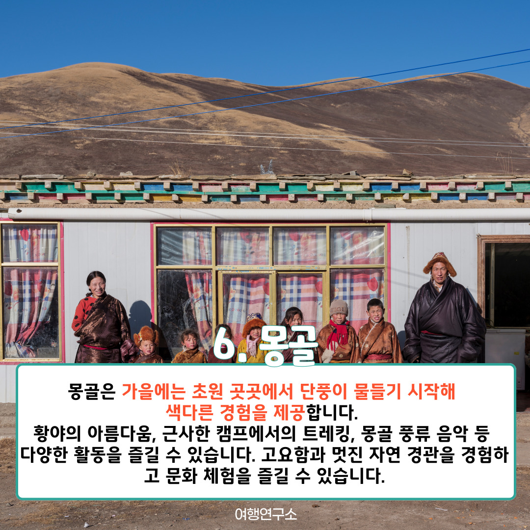 몽골은 가을에는 초원 곳곳에서 단풍이 물들기 시작해 색다른 경험을 제공합니다. 황야의 아름다움, 근사한 캠프에서의 트레킹, 몽골 풍류 음악 등 다양한 활동을 즐길 수 있습니다. 고요함과 멋진 자연 경관을 경험하고 문화 체험을 즐길 수 있습니다.