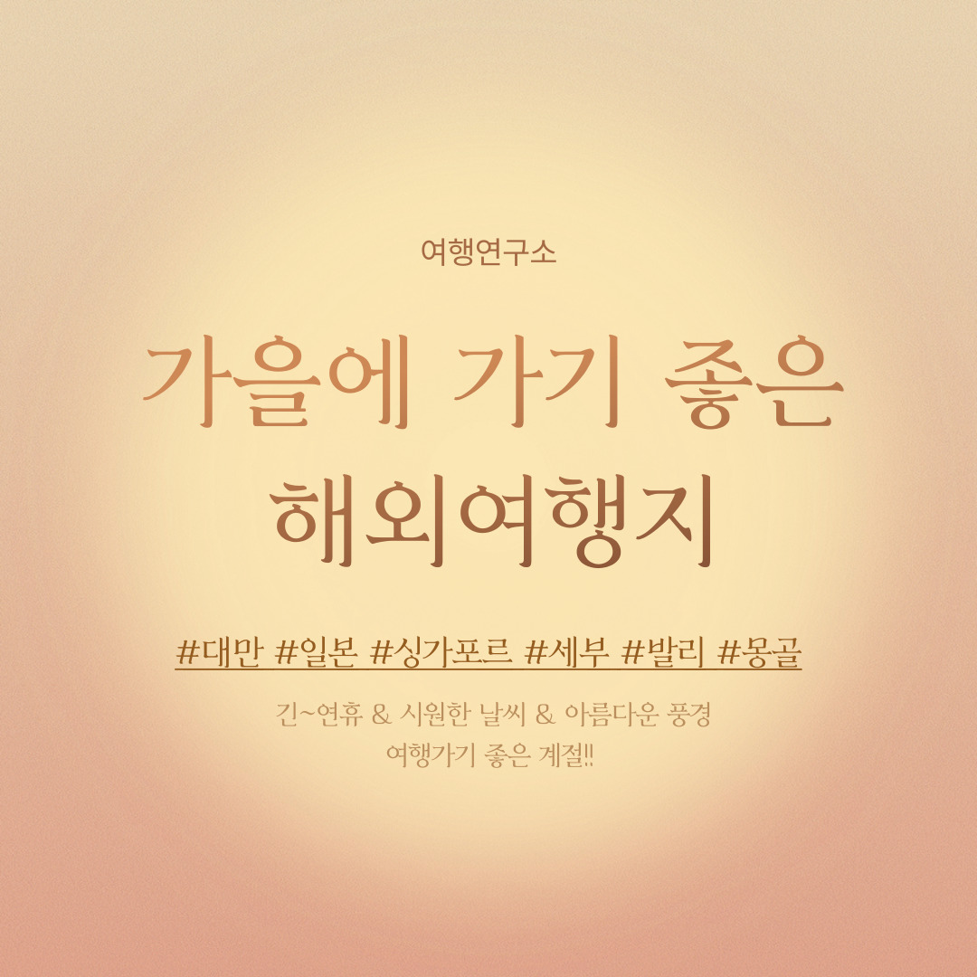 가을은 여행하기에 가장 좋은 계절 중 하나입니다. 시원한 날씨와 건기의 시작! 아름다운 자연경관, 문화 체험 등을 즐길 수 있는 가을 여행지로 대만, 일본, 싱가포르, 세부, 발리, 몽골을 추천드립니다. 아래 자료를 보시고 여행지 선택에 도움이 되었으면 좋겠습니다.