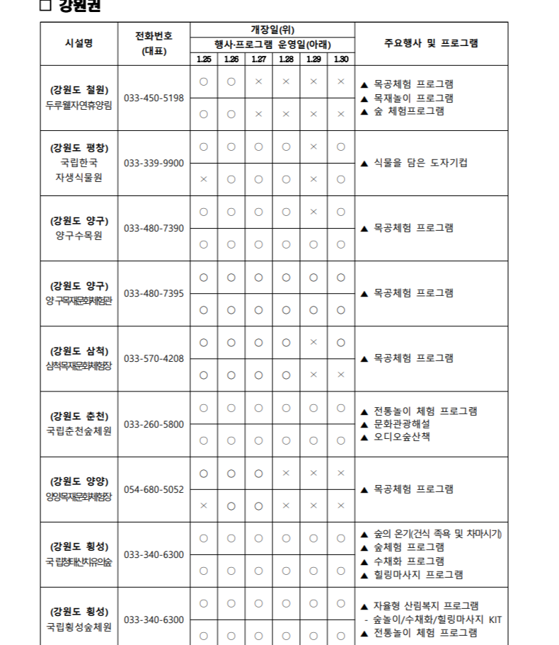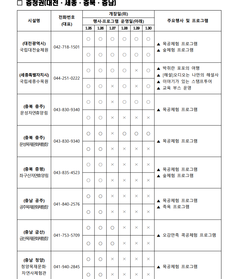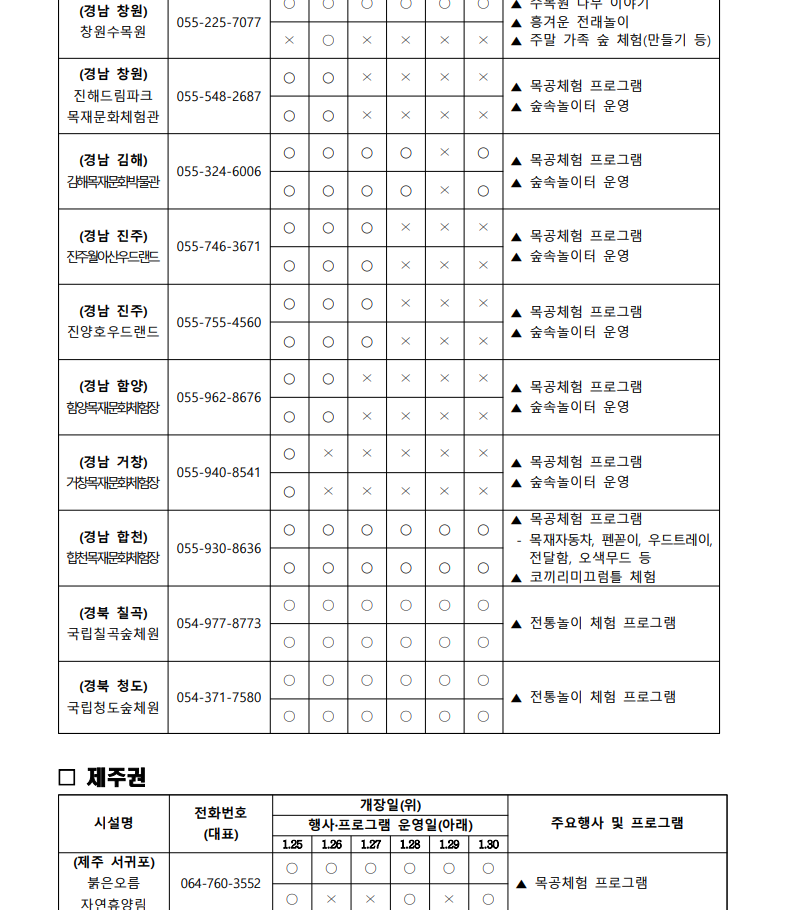 상세한 일정, 장소, 연락처 등은 '산림청 홈페이지 > 알림정보 > 알립니다’에서 확인하실 수 있습니다. 가족과 함께 소중한 추억을 만들고, 자연과 하나 되는 시간을 가져보세요!