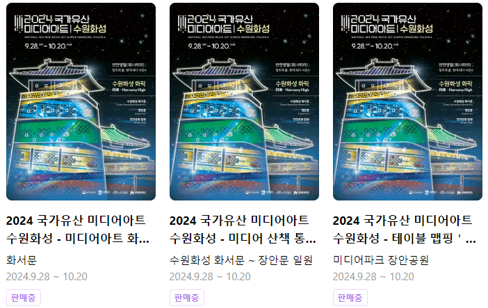 ● 티켓 예매: 수원화성 미디어아트의 티켓은 사전 예매제로 운영됩니다. 수원 문화재단의 공식 홈페이지를 통해 예약할 수 있으며, 조기 매진될 가능성이 있으므로 빠른 예약을 권장합니다.