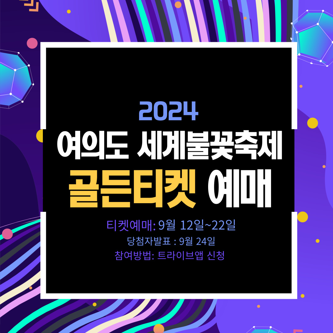골든티켓에 당첨되시면, 여의도 한강공원에서 열리는 불꽃쇼를 무료로 명당 자리에서 즐기실 수 있습니다. 이 기회를 통해 165,000원을 절약하실 수 있어요. 당첨자는 9월 24일에 발표되니, 서둘러 응모해 보세요!