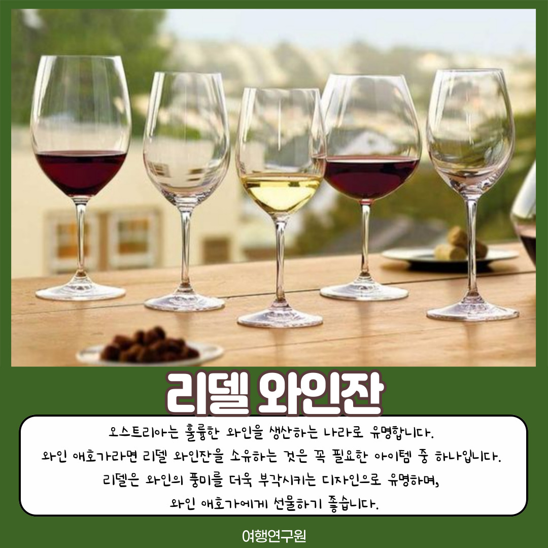 오스트리아는 훌륭한 와인을 생산하는 나라로 유명합니다. 와인 애호가라면 리델 와인잔을 소유하는 것은 꼭 필요한 아이템 중 하나입니다. 리델은 와인의 풍미를 더욱 부각시키는 디자인으로 유명하며, 와인 애호가에게 선물하기 좋습니다.