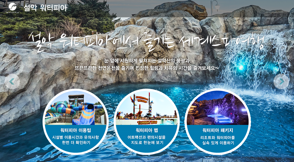 설악산의 경치를 감상하며 즐기는 천연 온천수! 워터파크와 온천의 완벽한 조화로 스릴과 힐링을 동시에 느낄 수 있어요.