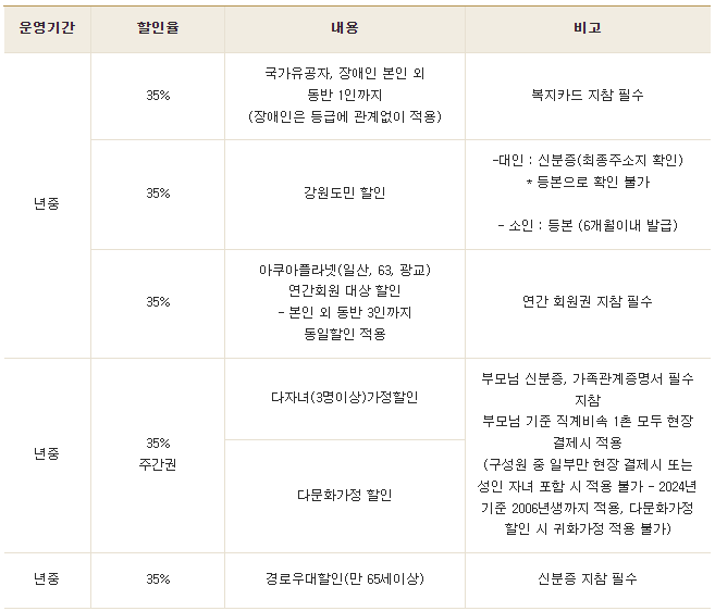 | 장애인/국가유공자 | 사우나 20% / 스파 20% | 증빙서류 지참 필수 |