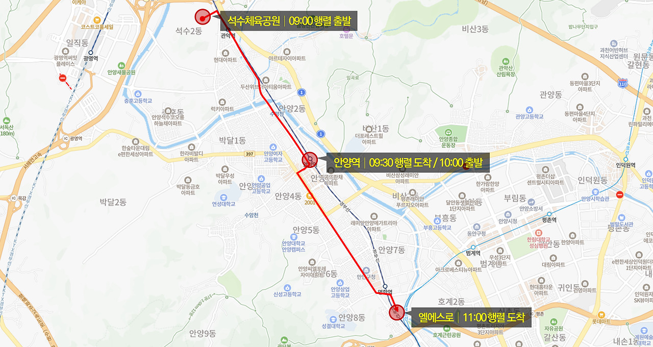 📍 구간: 석수체육공원 → 안양역 → 수원종합운동장 → 장안문 → 행궁광장 (총 7.6km)