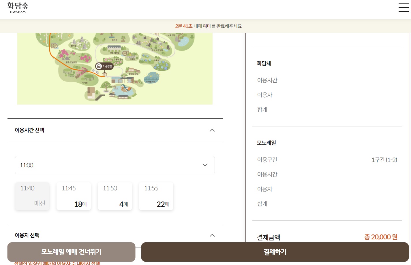 날짜/시간/인원 선택 - 모노레일 시간/인원 선택 - 결재하기