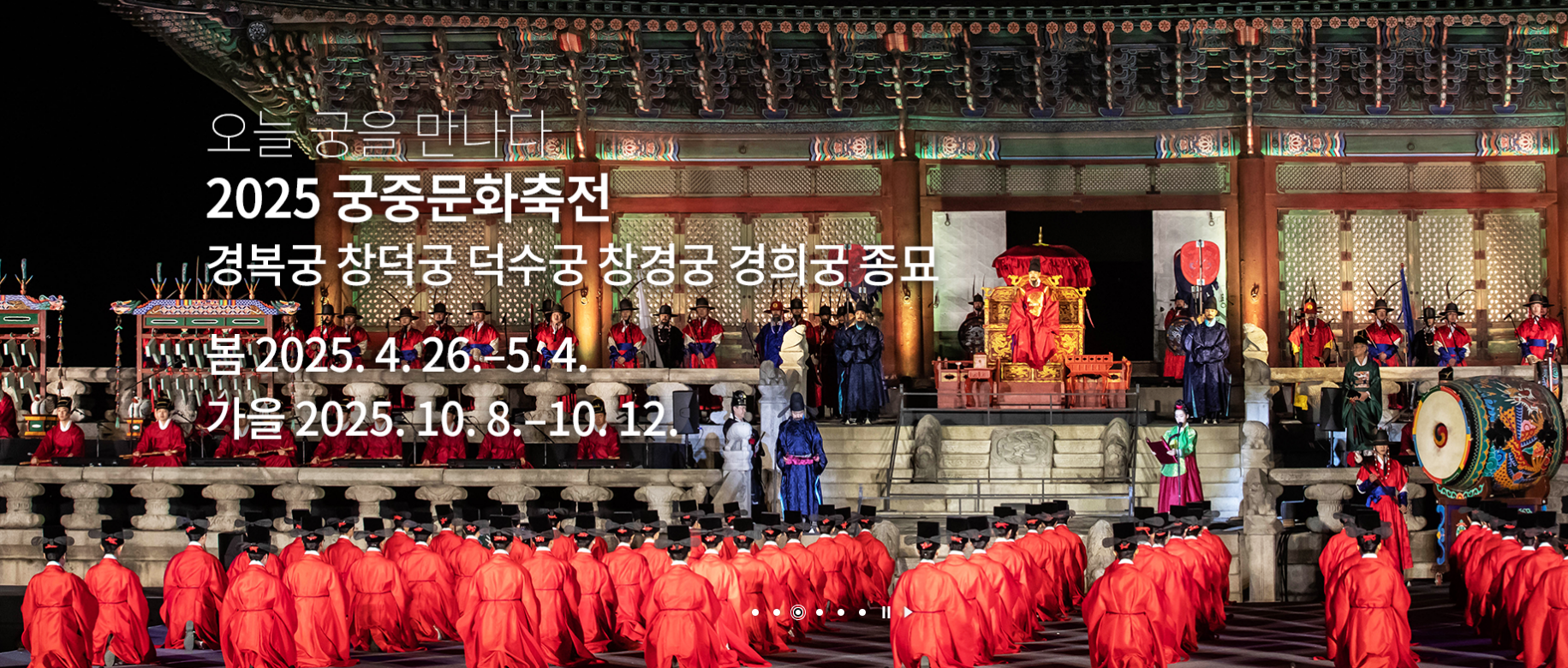 '오늘, 궁을 만나다’라는 슬로건 아래 조선 왕실의 역사를 현대적으로 재해석하는 문화유산 축제로서 각 궁궐에서는 역사적 의례 재현, 전통공연, 야경 투어 등이 진행됩니다. 한국 전통문화와 건축의 아름다움을 가까이에서 체험할 수 있어 외국인 관광객에게도 인기입니다.