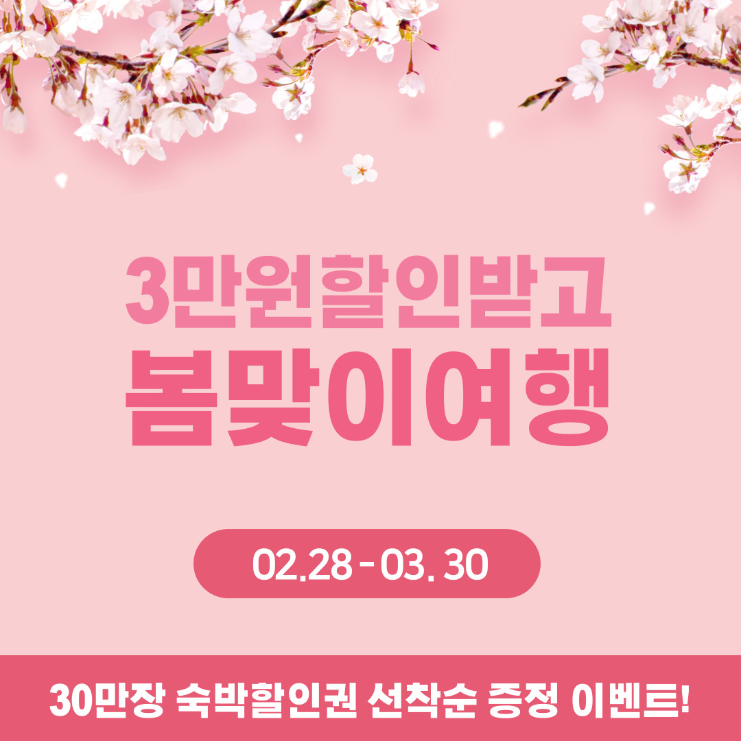 여러분! 따뜻한 봄이 성큼 다가왔습니다. 여러분은 어떤 여행을 계획하고 계신가요? 이번 3월, '대한민국 숙박세일 페스타’에서 제공하는 특별한 숙박 할인 혜택을 통해 사랑하는 사람들과 소중한 추억을 만들어보세요! 🌷