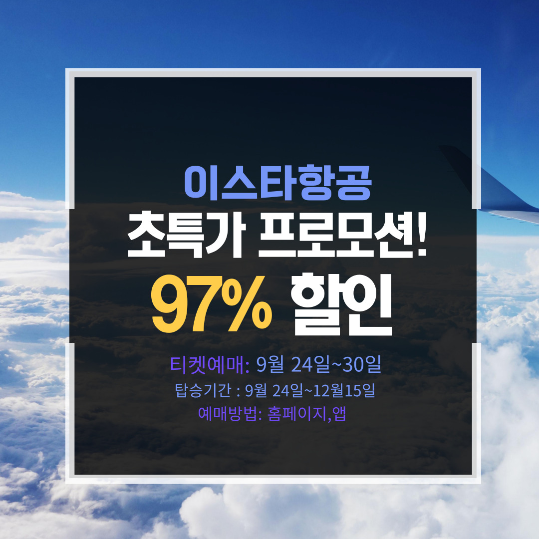 이스타항공의 이번 프로모션은 정말 매력적인 기회입니다. 최대 97% 할인과 여정 변경 수수료 무제한 면제라는 두 가지 장점 덕분에 마음 편히 여행을 계획할 수 있을 것 같습니다. 여러분도 이 기회를 놓치지 마시고, 꿈꾸던 여행지를 향해 떠나보세요! 지금 바로 이스타항공 홈페이지를 방문해서 특가 항공권을 예약해보세요! 기회를 놓치지 말고, 여러분의 여행 꿈을 실현해보세요. 즐거운 여행 되시길 바랍니다! ✈️🌏
